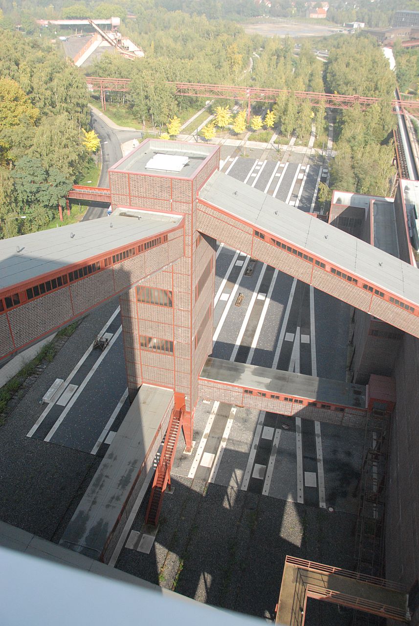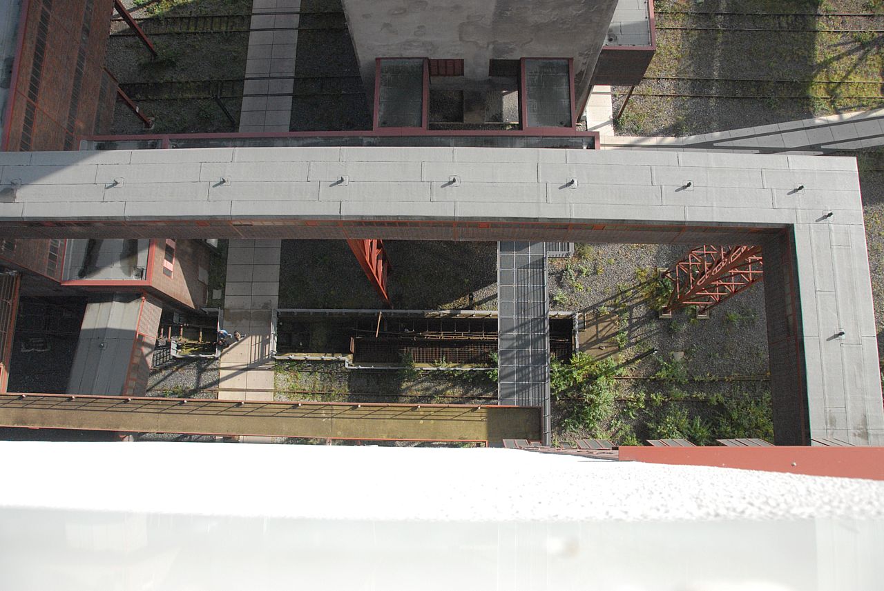 Zollverein XII - Blick nach unten vom Dach der Kohlenwäsche. Am oberen Bildrand ist der Kokskohlenbunker zu erkennen. / A look downwards from the coalwashing plant. On the top edge of the picture you can see the coking coal bunker. |