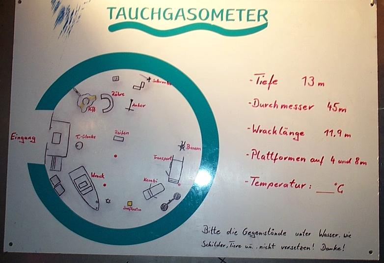 des Tauchgasometers mit seinen unterwasser installierten Utensilien aufgezeichnet ist. Zum